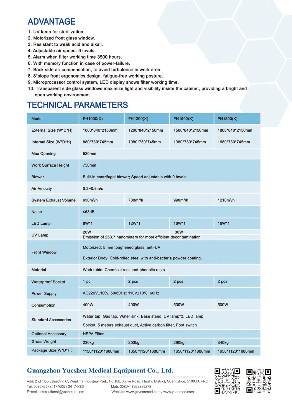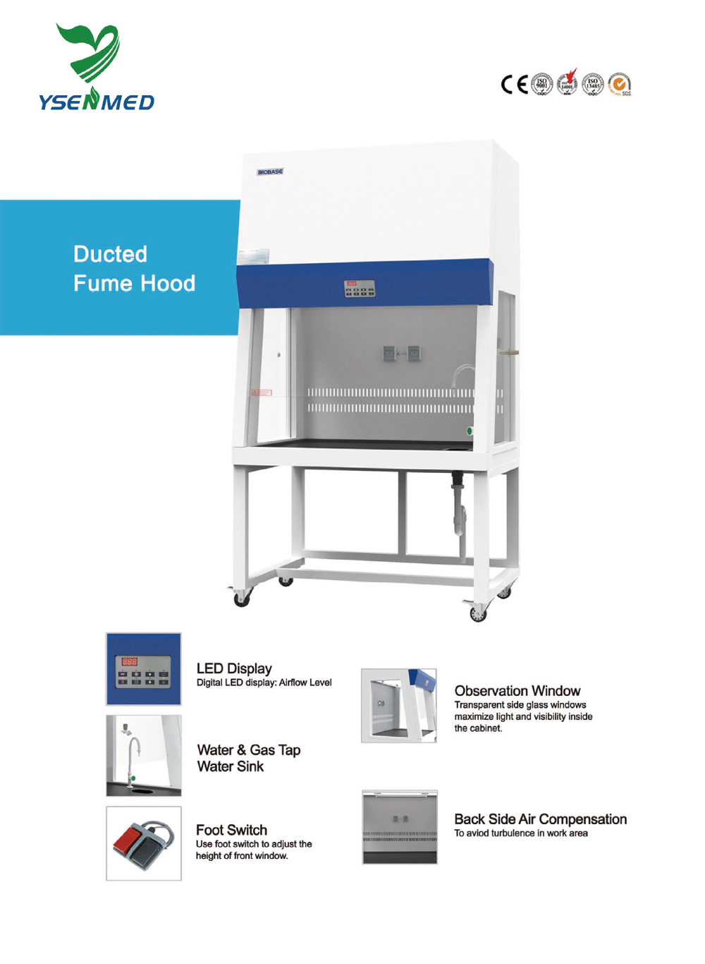 Fume Hood is a kind of negative pressure ventilation system for protecting operator and laboratory environment. Room air flows inward from the front opening of the Fume Hood and is consistently ventilated by the extract blower. Therefore, contaminated fumes, vapors, toxic gasses, aerosol and corrosive substance which are probably generated during experiments could be prevented from spreading to the operator or into the laboratory room. In addition, the polluted air could be purified by the active carbon filter before exhausting through the duct. Thus, the outdoor environment could also be protected.