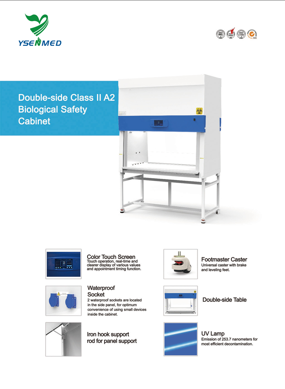 Features: 1. There are two front openings for easy operation, which can be operated by two people at the same time. 2. It is convenient for the installation and replacement of high-efficiency filters. 3. The cabinet is designed with an inclined angle, which conforms to the principle of ergonomics and has a larger viewing angle. 4. The working area adopts a negative pressure surround design, which is safer. 5. The workbench adopts a basin-shaped design, even if the waste liquid overflows in the experiment, it will not flow into the liquid accumulation tank, which is easy to clean. 6. The integrated design of casters and brackets can be fixed and leveled by adjusting the legs of the casters. 7. The cabinet and bracket can be separated, and the height of the bracket can be customized. 8. The maintenance and replacement of the filter and fan of the safety cabinet can be carried out at the front side of the safety cabinet, which is more convenient. 9. The glass adopts double-layer laminated explosion-proof safety glass, even if the glass is broken, it will not hurt people. 10. 7-inch touch screen, displaying the dynamics of airflow, downflow velocity, inflow velocity, temperature, humidity, clock, resistance of supply and exhaust filters. 11. Power-off recovery function: key memory function, fan, sunlight, lighting with power-off memory function. 12. Screen lock function: touch the lock screen button, the operation interface is locked, and other function keys are locked at the same time. 13. It has the timer switch function of fan, ultraviolet and socket, and the timer shutdown function; it saves working time. 14. User password modification, the user can set the power-on password of the safety cabinet. 15. Through the selection of high-quality fans and high-efficiency filters, and the reasonable design of the air duct structure, the air velocity of the biological safety cabinet must meet the requirements.