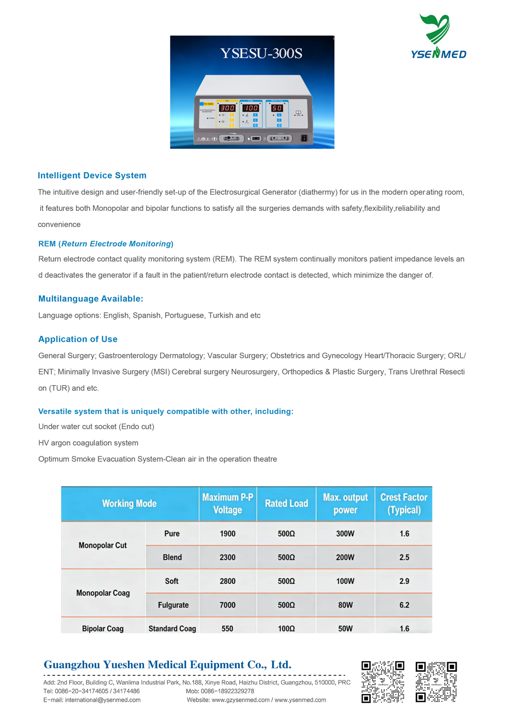 YSESU-300S Electrosurgical Generator: High-power monopolar & bipolar modes for diverse surgeries with REM safety monitoring.