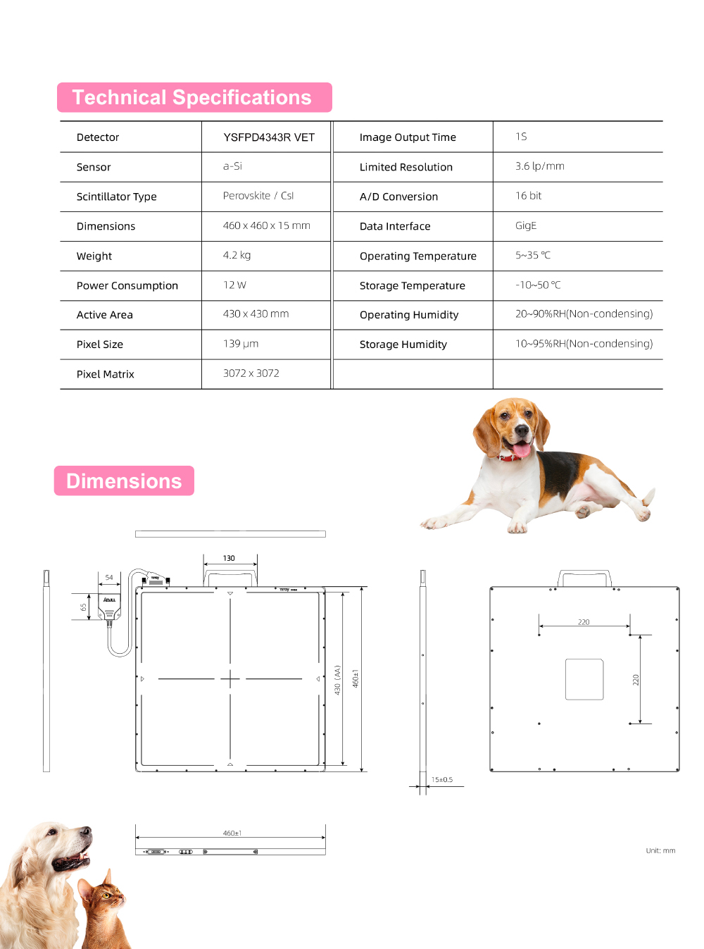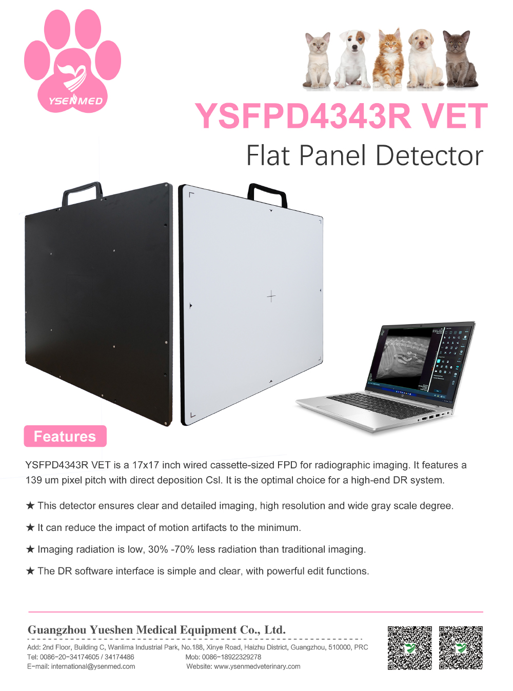 Features YSFPD4343R VET is a 17x17 inch wired cassette-sized FPD for radiographic imaging. It features a139 um pixel pitch with direct deposition Csl. It is the optimal choice for a high-end DR system. This detector ensures clear and detailed imaging, high resolution and wide gray scale degree. It can reduce the impact of motion artifacts to the minimum. Imaging radiation is low, 30%-70% less radiation than traditional imaging. The DR software interface is simple and clear, with powerful edit functions.