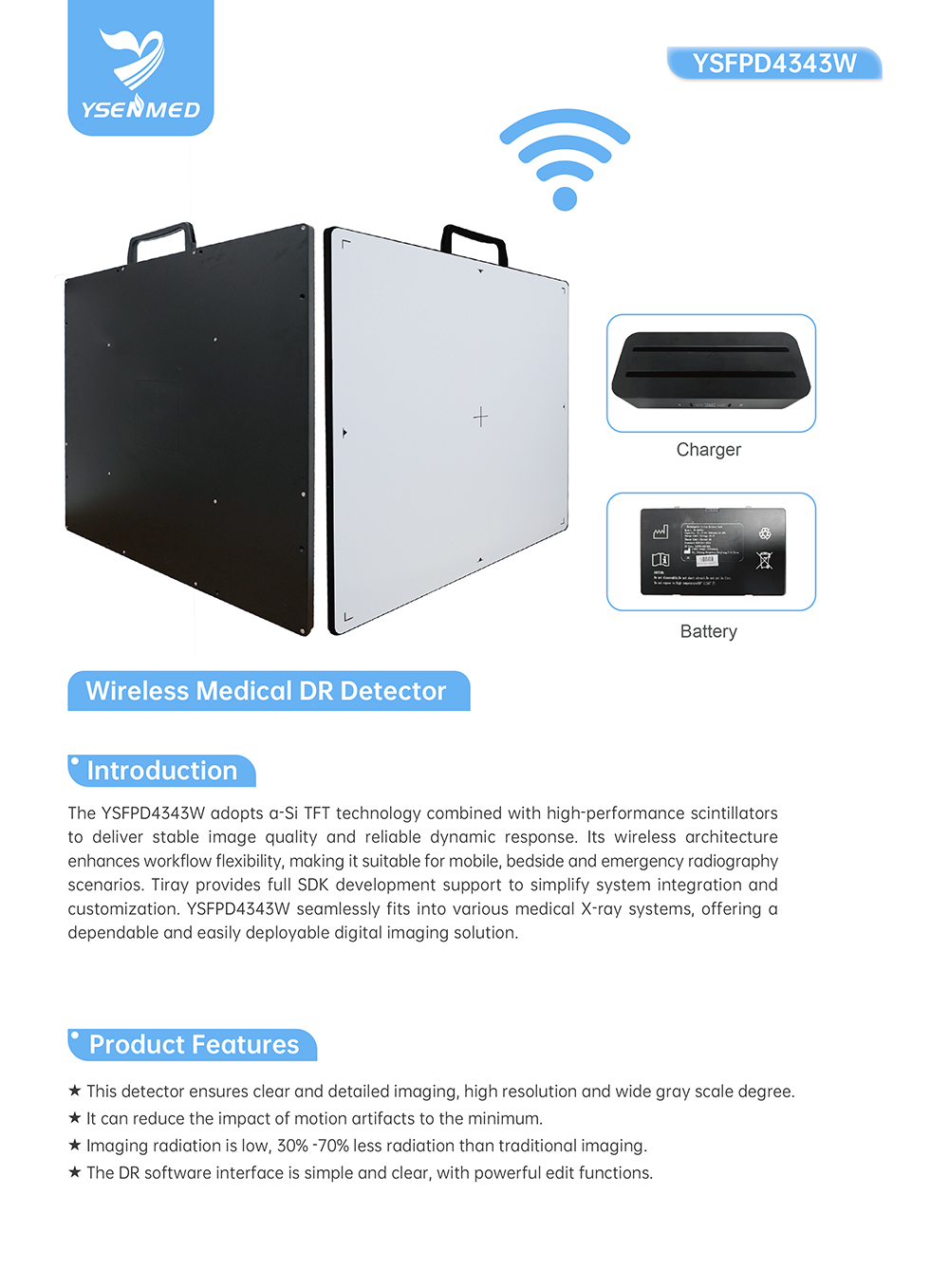 YSFPD4343W wireless DR flat panel detector delivers clear, low-dose X-ray imaging with flexible workflow for mobile and clinical use.