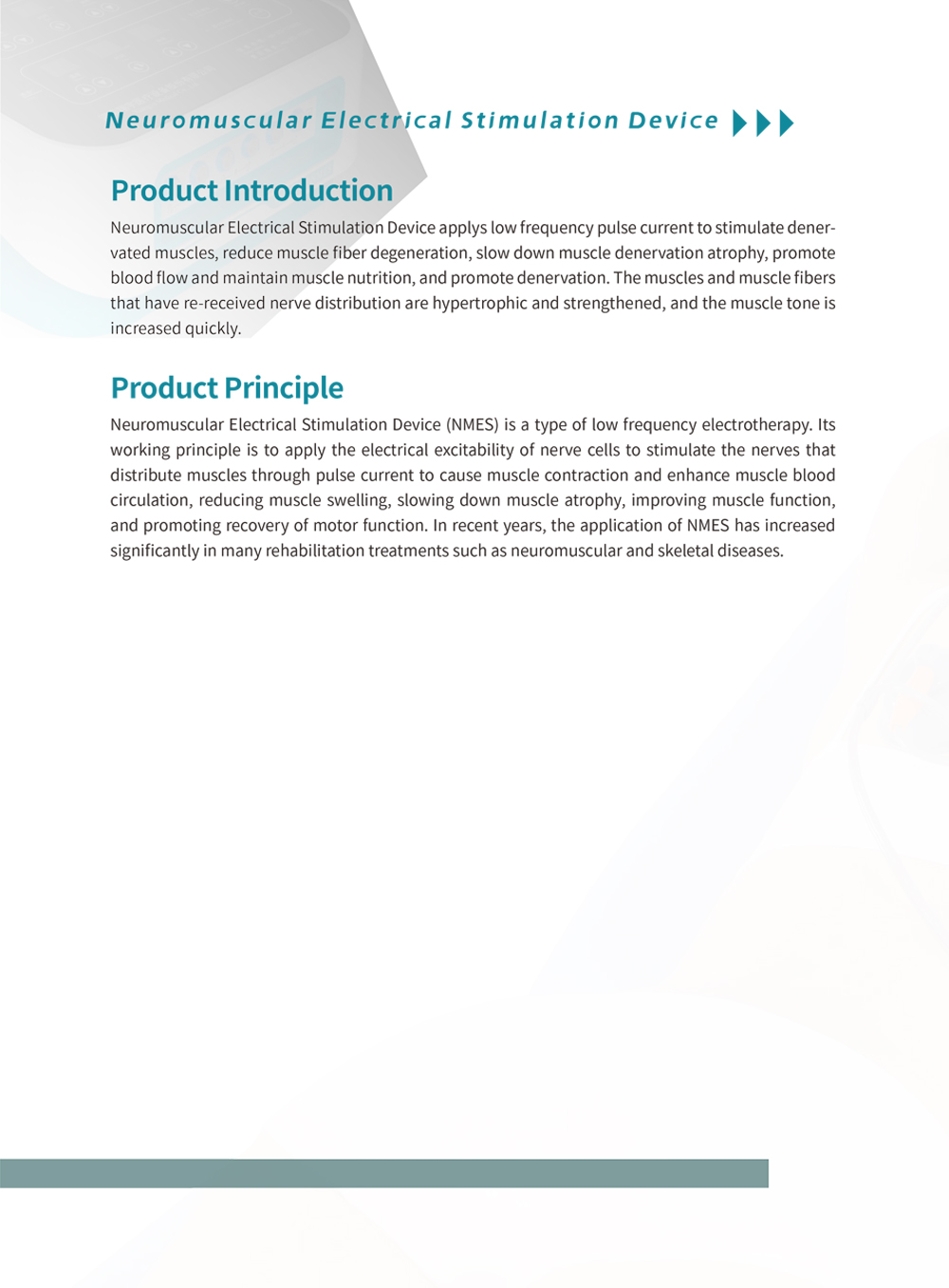 Advantages 1. The Ⅰ grade (complete nerve loss) : the output pulse frequency is 500Hz, the modulated wave frequency is continuously adjustable from 0.5Hz to 5Hz, and the tolerance is ±15%. The Ⅱ gear (partially denerved) : the output pulse frequency is continuously adjustable from 0.5Hz to 5Hz, and the tolerance is±15%.
