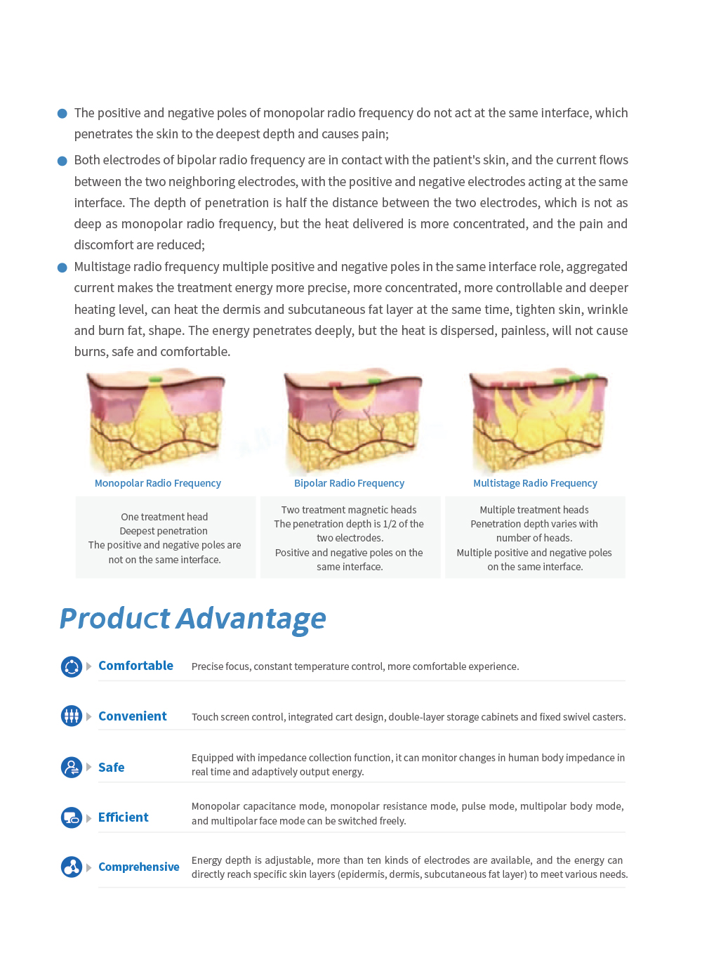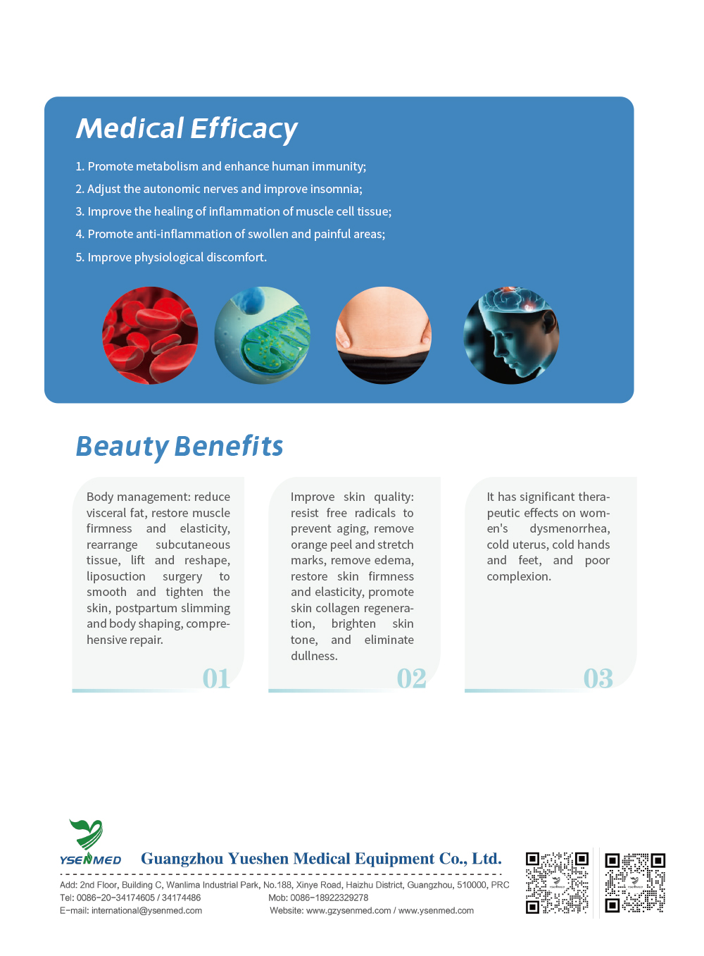 Advantages 1.The surface of the main machine should be clean, smooth and uniform in color. 2.The connection of the treatment handle should be firm and reliable. 3.The main machine, electrode and treatment handle are composed. 4.Prescription can be stored freely, the number of stored prescriptions is 10. Scope of Application Trauma Application: Provides pain relief; Reduces inflammation and edema; Aids in the treatment of fractures, sprains, and muscle tears. Rheumatic Application: Effective in treating arthritis, tendinopathy, cervical pain, and lower back pain Application in Sports Physiotherapy: Facilitates rehabilitation and prevention of sports injuries; Enhances muscle strengthening training. Skin Care and Beauty Application: Promotes collagen regeneration in the skin; Firms the skin while scavenging free radicals; Assists in fat burning for a slimmer body shape; Alleviates muscle tension and discomfort; Accelerates metabolism of facial and leg edema.