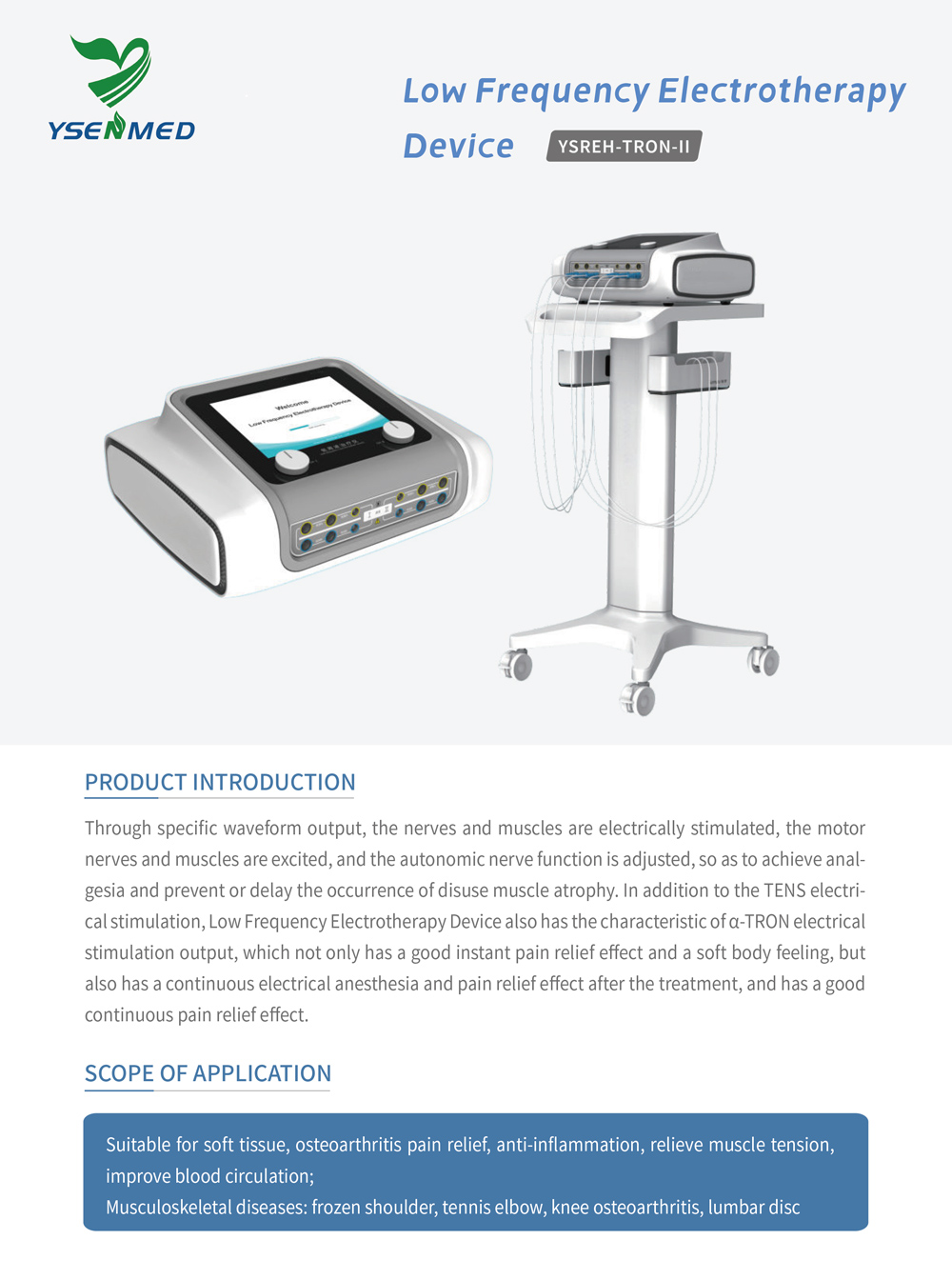 YSREH-TRON-II Low Frequency Electrotherapy Device – Touch-controlled electrotherapy for effective pain relief, muscle relaxation, and improved circulation in clinical use.