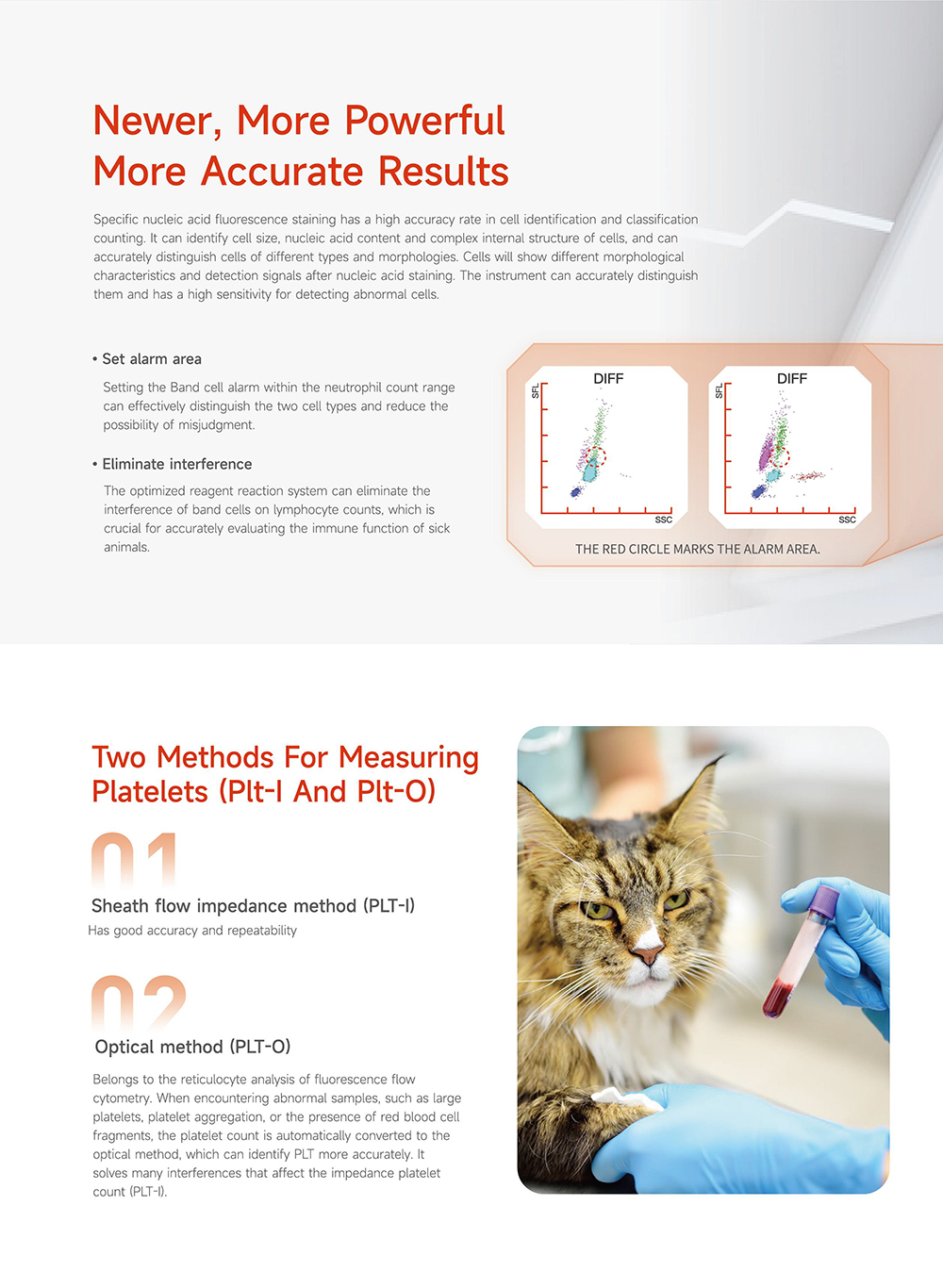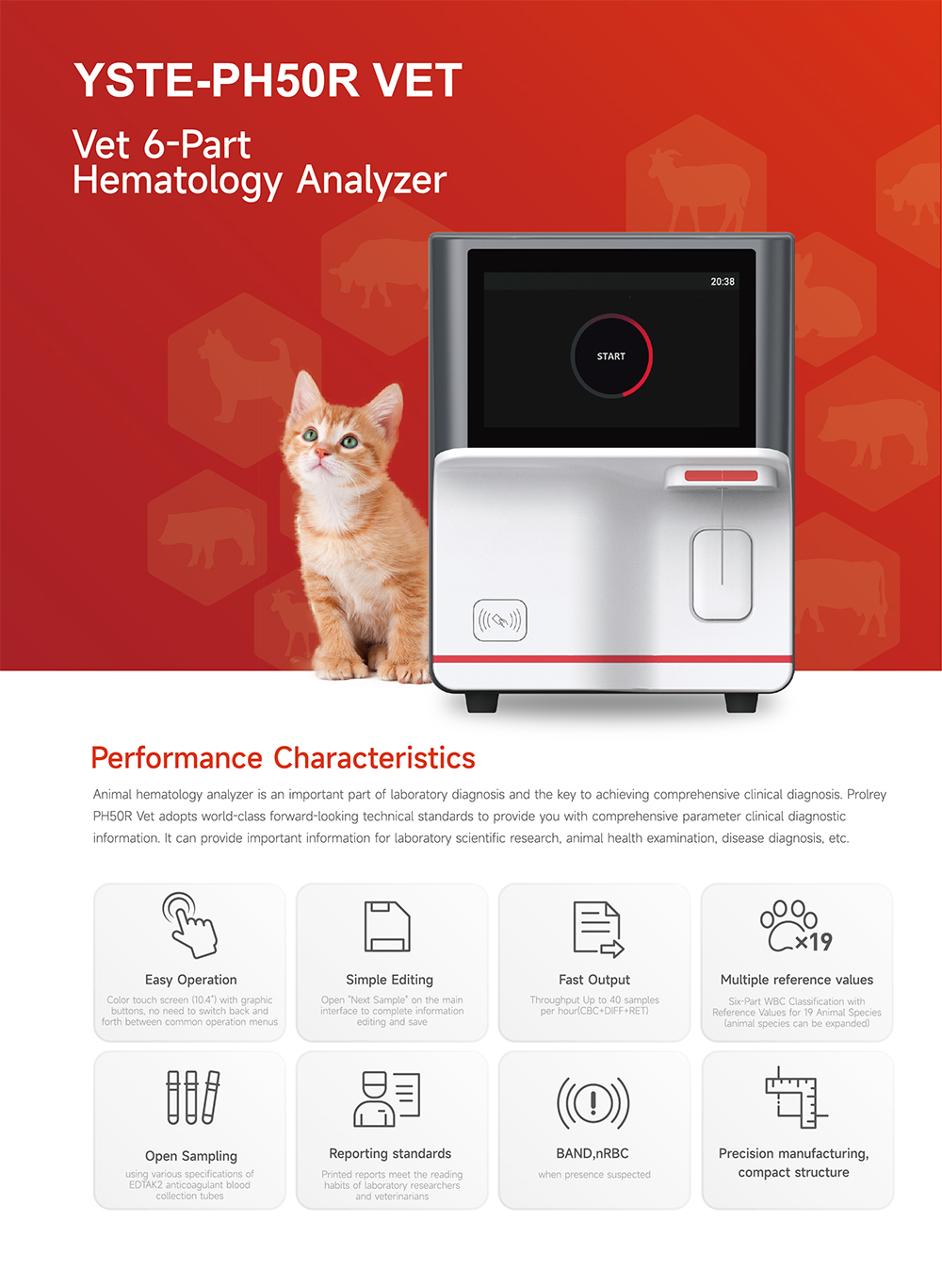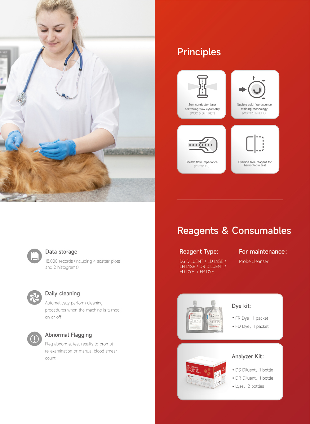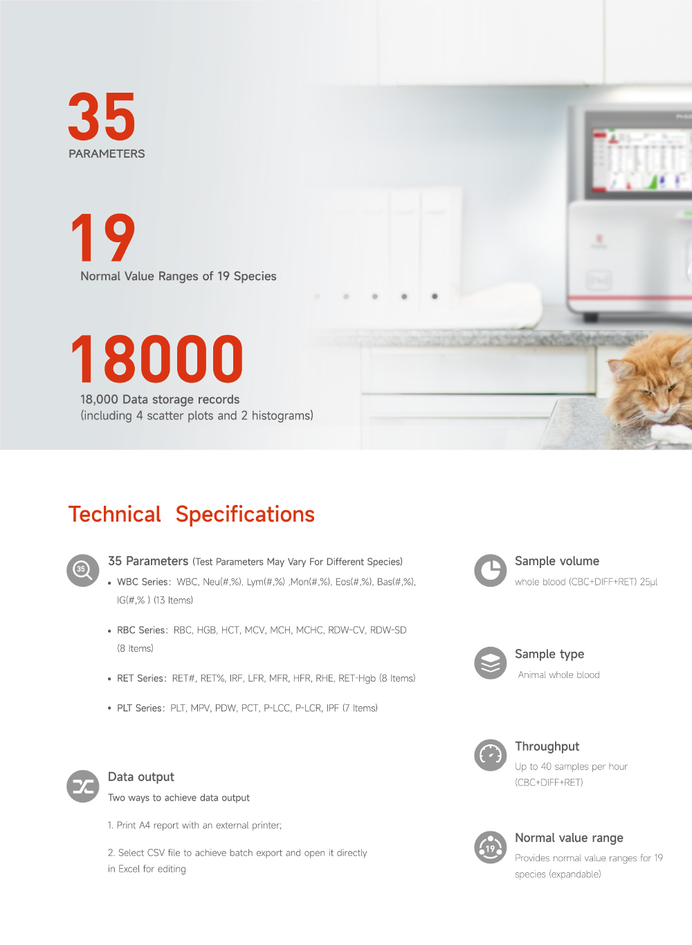 35 detection parameters: WBC Series:WBC、Neu#、Lym#、Mon#、Eos#、Bas#、Neu%、Lym%、Mon%、Eos%、Bas%、IG#、IG% RBCSeries:RBC、HGB、HCT、MCV、MCH、MCHC、RDW-CV、RDW-SD PLTSeries:PLT、MPV、PDW、PCT、P-LCC、P-LCR、IPF RETSeries:RET#、RET%、IRF、LFR、MFR、HFR、RET-He *The number of report parameters may vary depending on the animal species.