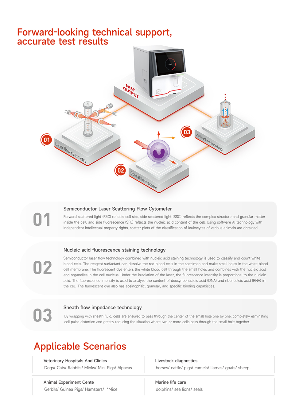 Applicable scenarios: Pet hospitals and clinics: dogs, cats, rabbits, ferrets, miniature pigs, alpacas Livestock diagnosis: horses, cattle, pigs, camels, llamas, goats, sheep Animal Experiment Center: Gerbils, Guinea Pigs, Hamsters, Mice Marine life health: Dolphins, sea lions, seals Animal species can be expanded
