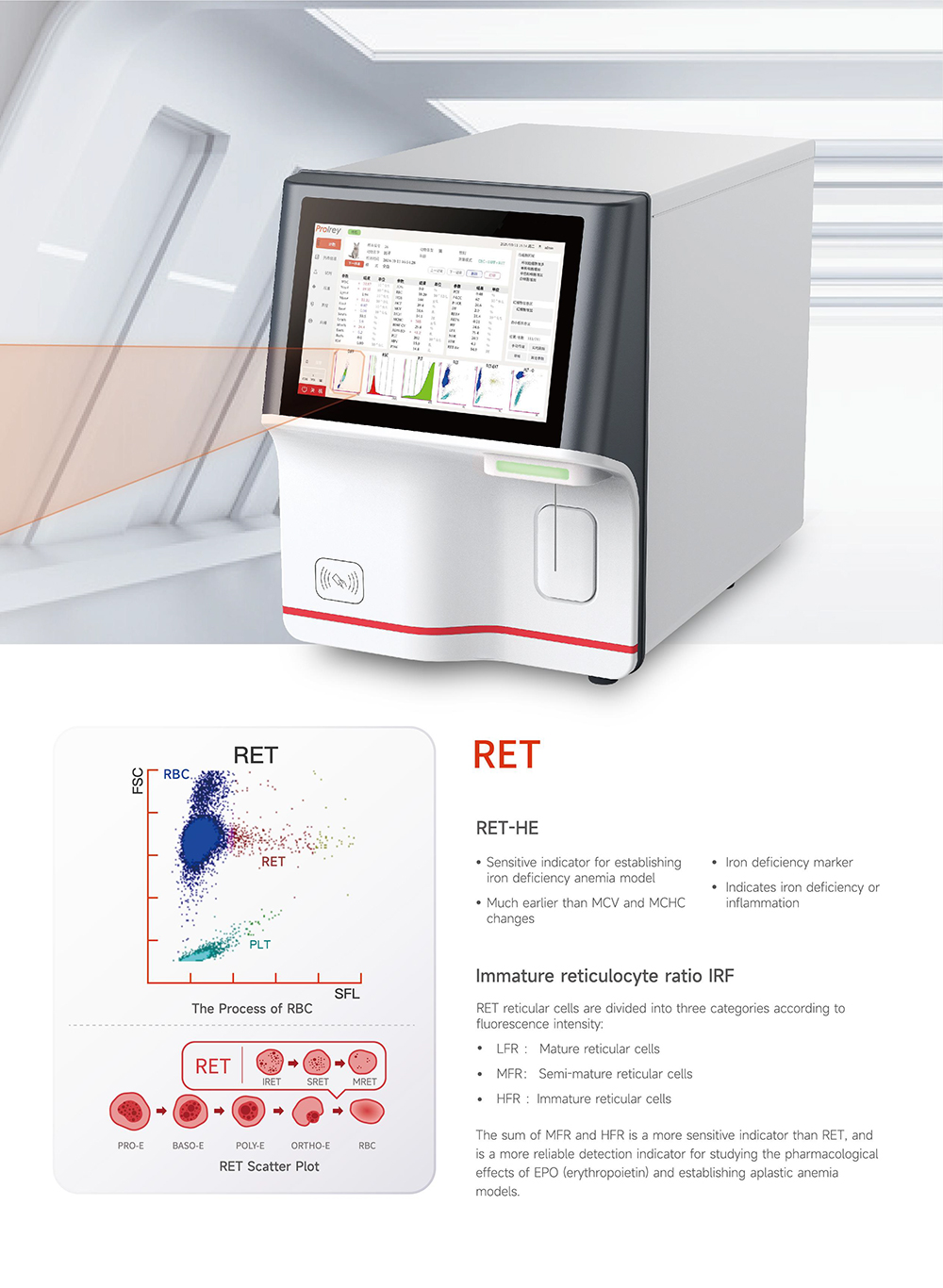 It is particularly suitable for patients who are highly susceptible to infection due to a suppressed immune system, as an increase in IG count indicates the severity of an early innate immune response. On traditional blood analyzers, the presence of immature granulocytes is usually flagged, requiring microscopic examination. This methodological IG counting significantly reduces this screening rate. It allows inclusion in the complete CBC+DIFF analysis, making it a valuable sixth subset of leukocytes. Based on their fluorescence intensity, RET cells are divided into three categories : LFR (low fluorescence ratio) mature reticular cells MFR (medium fluorescence ratio) semi-mature reticular cells HFR (high fluorescence ratio) immature reticular cells RET-He reticulocyte hemoglobin content RET-He is the fastest method for detecting changes in iron status and is an early marker of disease—earlier than clinical chemical markers. It is considered the most sensitive indicator of iron availability for erythropoiesis currently available. Since red blood cells have a lifespan of 120 days, detecting iron deficiency and changes in iron status in erythropoiesis using classic hematological parameters such as HGB, MCV, and MCH, or by measuring hypochromic red blood cells, can only be done relatively late.