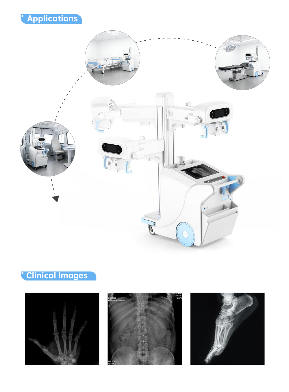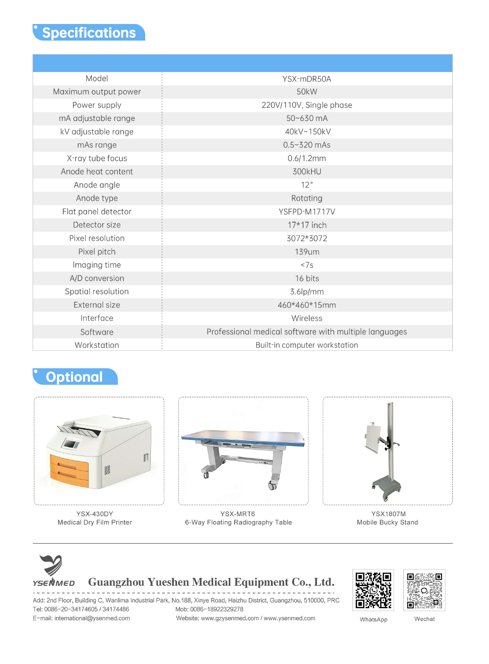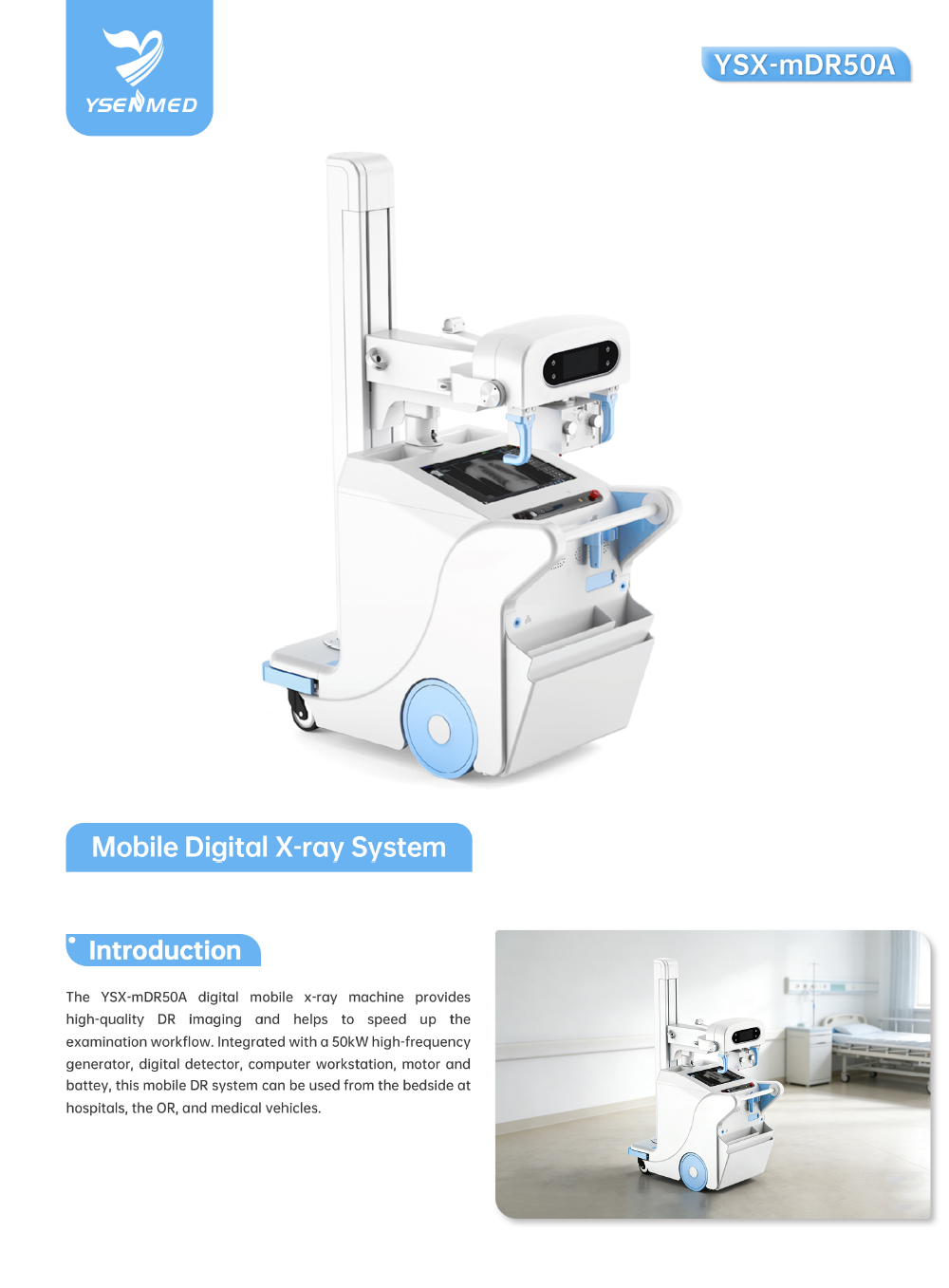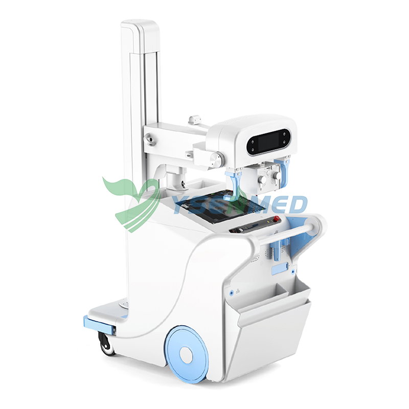 YSX-mDR50A 50kW Digital Mobile X-ray System with wireless 14×17″ flat panel detector, high-frequency generator, mobile stand, battery power unit and optional tablet for fast, high-res imaging.